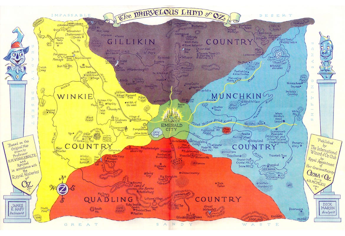 But something changed the way I viewed the movie. My second oldest brother gave me a copy of the original book, The Wonderful Wizard of Oz. That was a turning point for me. For one thing, the slippers were silver and not ruby. And there were two good witches. The Good Witch of the North (Gillikin Country) was not Glinda; she was the Good Witch of the South (Quadling Country), and met much later in the book. There were other intriguing differences, like how each country in the land of Oz has a different color scheme. (Down to the houses, outfits, flowers, etc. in each country.)