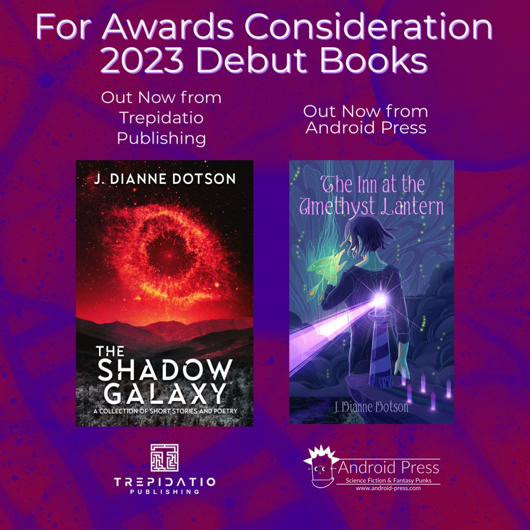 The Shadow Galaxy: A Collection of Short Stories and Poetry is a sci-fi/horror/fantasy/Appalachian debut collection available from Trepidatio Publishing under my alt name J. Dianne Dotson. It fits into poetry, short fiction, collections, women’s fiction, Appalachian fiction, horror, sci-fi, and fantasy.