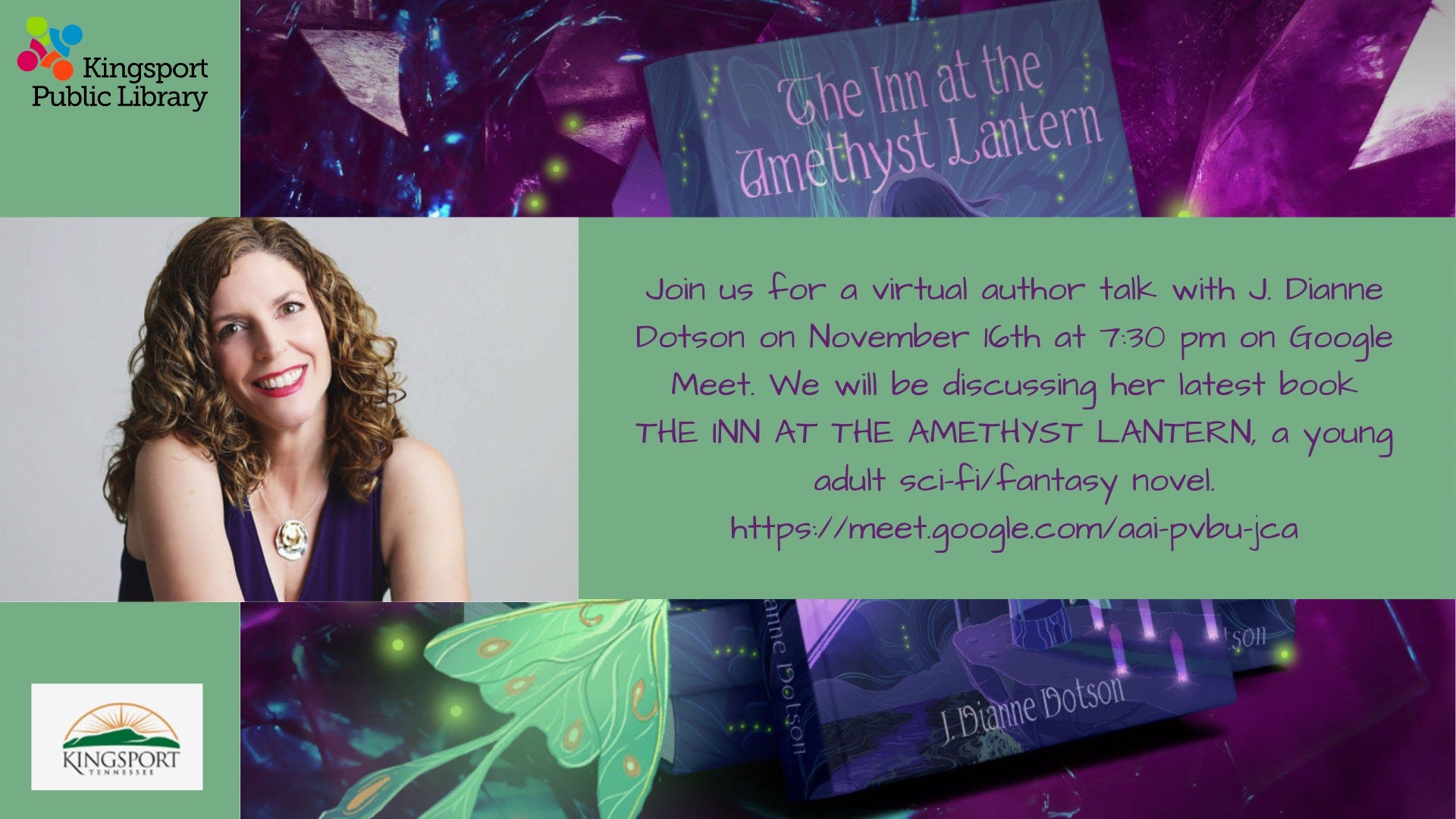 My original hometown Kingsport Public Library hosts me for a virtual talk about The Inn at the Amethyst Lantern. All the details for joining in can be found HERE.