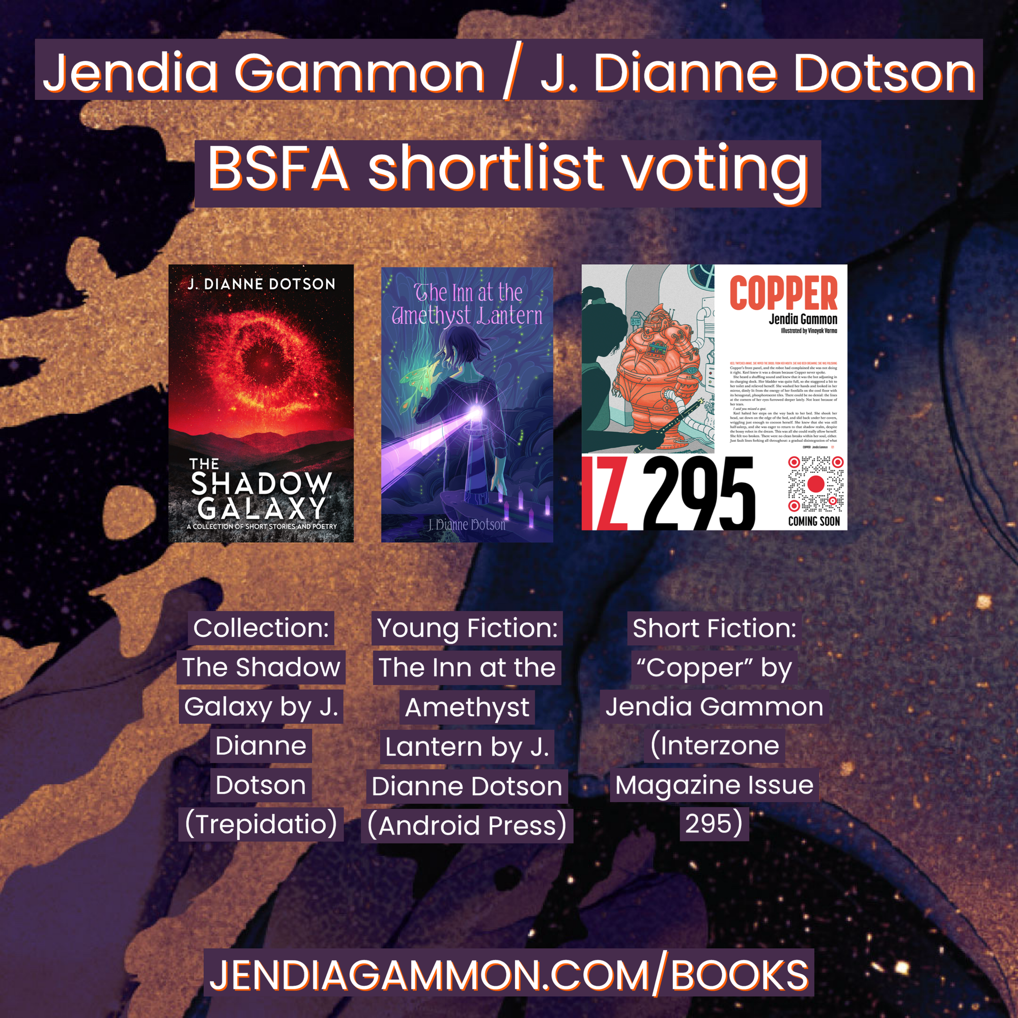 Note that "Copper" and THE INN AT THE AMETHYST LANTERN are also longlisted for the BSFW Awards and are on the Nebula Awards (SFWA) reading list! For short fiction and the Norton younger readers award, respectively.