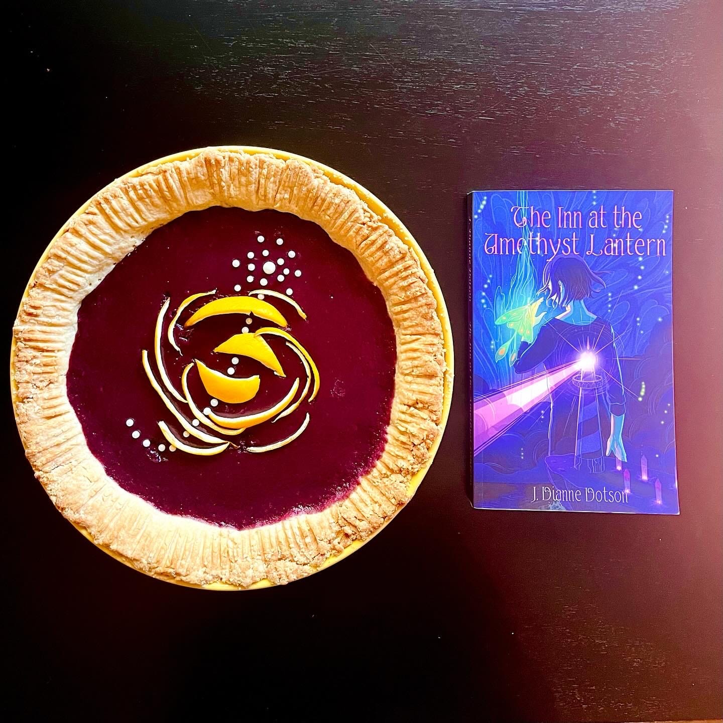 Here's my Nebula Award logo pie I baked on Pi Day (3.14, get it?) which was the day the announcements went out. It's a blueberry and Meyer lemon curd pie with a shortbread crust, all from scratch by me, and it's delish!