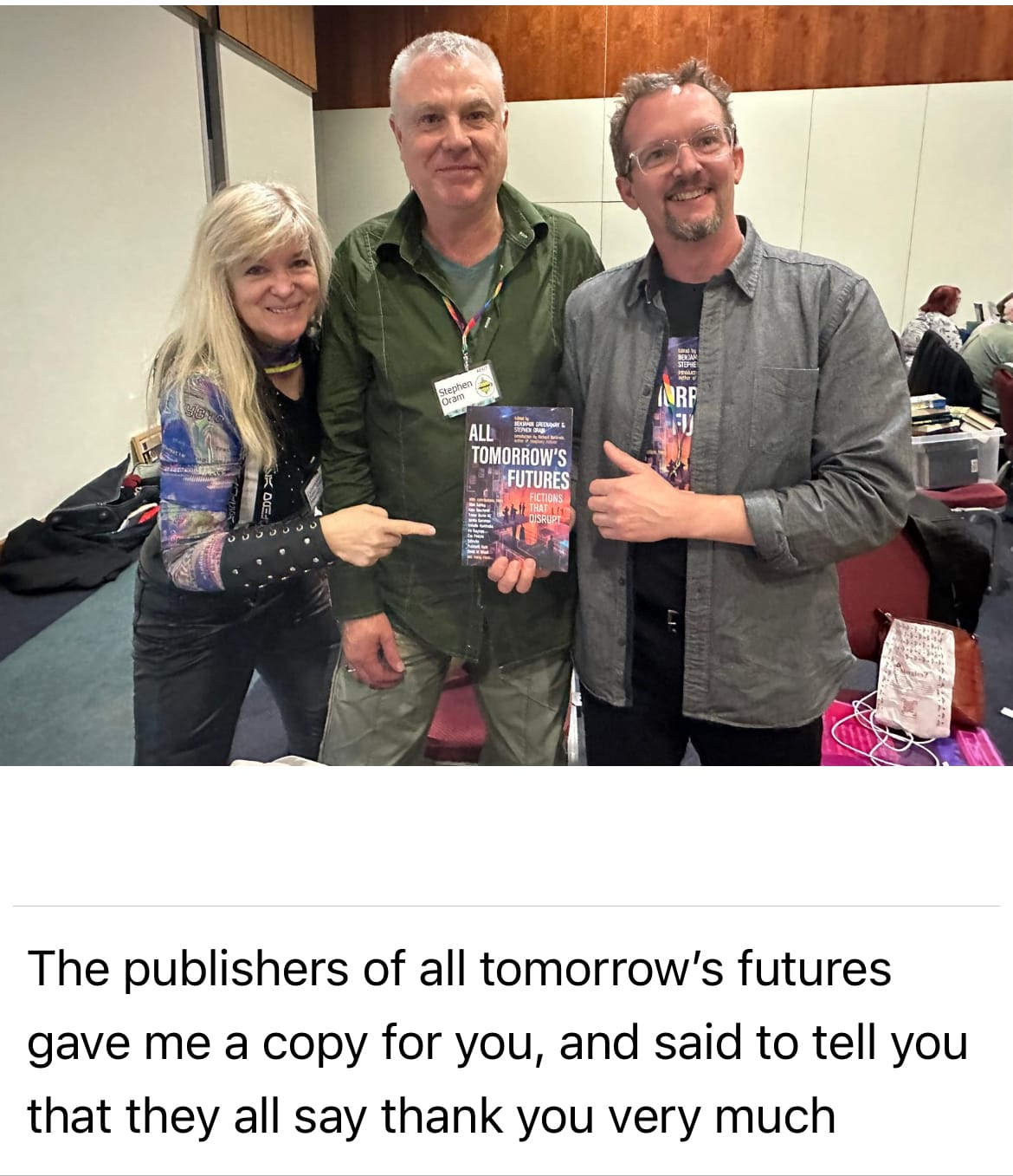 In case you missed it, a new anthology I'm in has just come out! I think the ebook deal is about to end (it was 99 cents!) so you might want to jump on that. The book is called ALL TOMORROW'S FUTURES: FICTIONS THAT DISRUPT and it includes my short story, "The Theseus Stone," alongside many writers' scientist-approved near-future stories. (My name is on the front cover too!) I think you'll enjoy it! Here are the CyberSalon publishers, who gave my contributor copy to Gareth at EasterCon, to send to me, along with the nice comment they gave me: