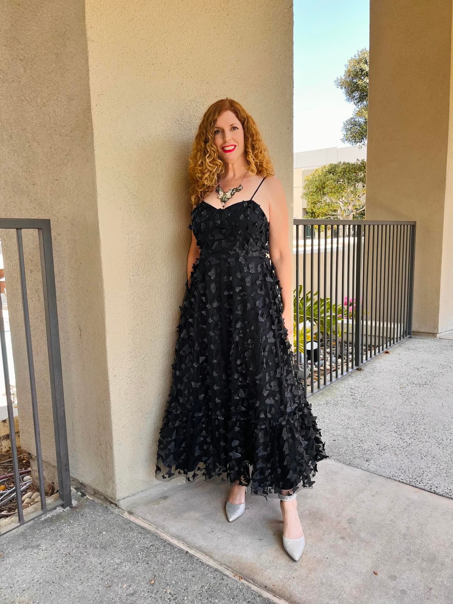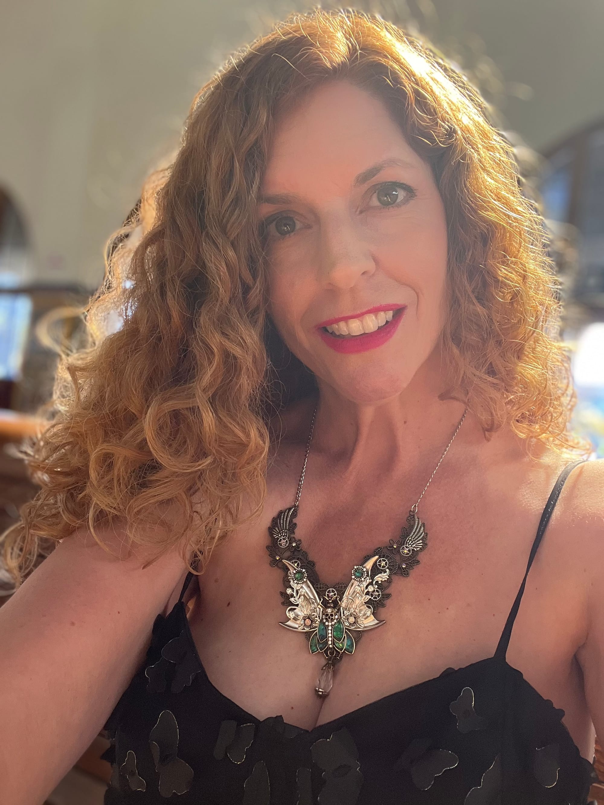 Jendia Gammon in a black butterfly dress with a steampunk gothic necklace.