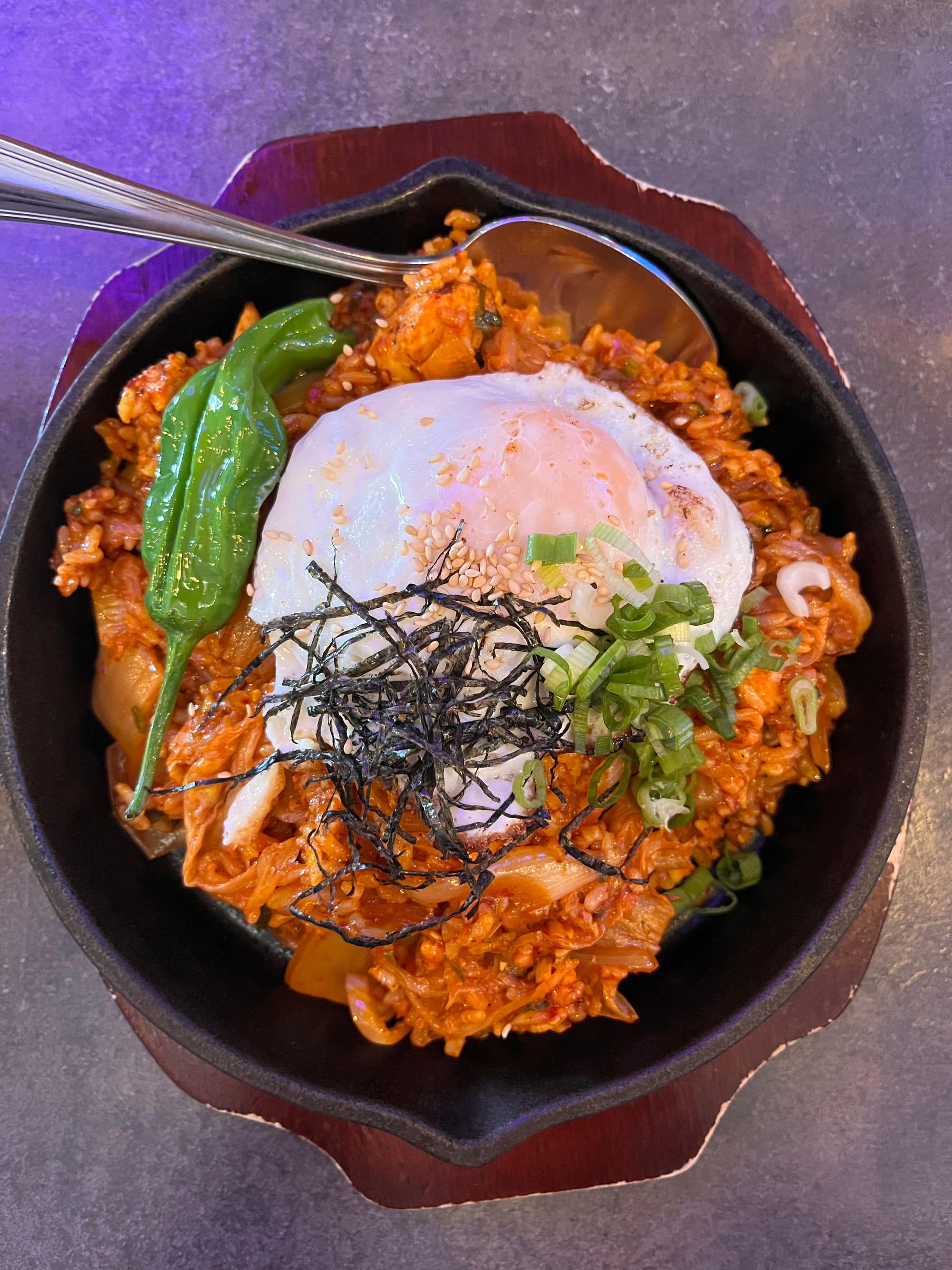 Scenes from Monrovia: the Warhammer Store & Cafe, a pan of kimchi fried rice with a fried egg on top, and plant-based almond butter chocolate chip ice cream.